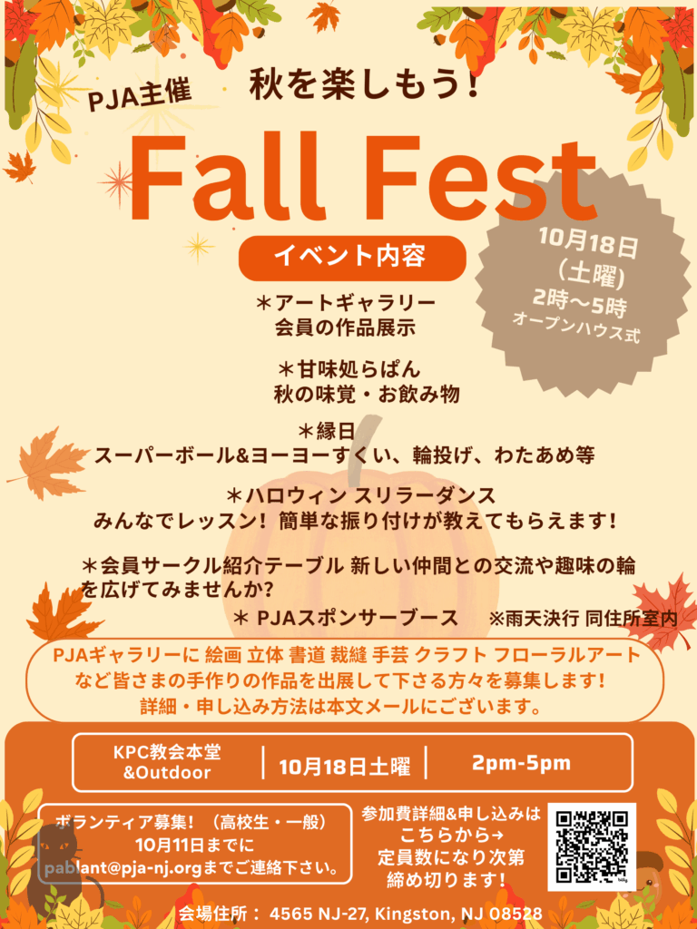 10月18日土曜、午後2時よりPJA主催「秋を楽しもう!PJAフォールフェスト」を開催します!