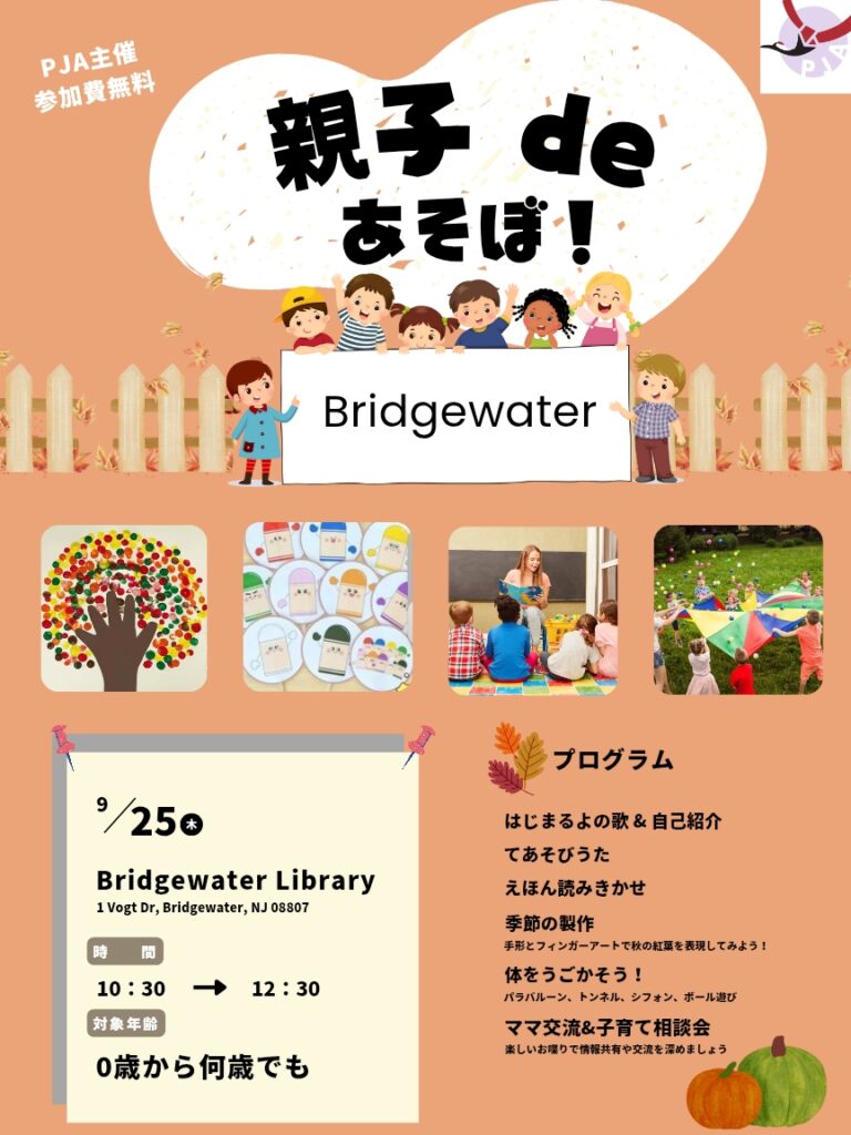 おはようございます。親子deあそぼ!@Bridgewaterイベントの告知です。親子deあそぼ! は毎月 🌼Montgomery Library🌼と🌼Bridgewater Library🌼2か所での開催となりました!両方のご参加も大歓迎です🥰
